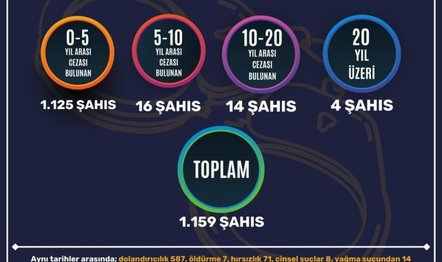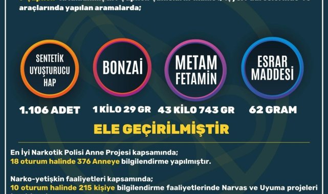 Mersin'de son bir haftada gerçekleştirilen çalışmalarda, haklarında çeşitli suçlardan yakalama kararı bulunan bin 159 kişi yakalandı. Uyuşturucu ile mücadele çalışmalarında ise yakalanan 130 şahıs hakkında işlem yapılırken, 9 şüpheli de tutuklandı.Mersin'de 'Güvenlik, Asayiş Değerlendirme Toplantısı' Vali Ali Hamza Pehlivan başkanlığında yapıldı. Toplantıda il genelinde güvenlik ve asayiş konularında gerçekleştirilen çalışmalar, alınan tedbirler ile suç ve suçlulara karşı düzenlenen operasyonlar ele alındı. Vali Pehlivan, toplantıyla ilgili yaptığı açıklamada, 20-26 Ocak arasında emniyet ve jandarma ekiplerince yürütülen operasyonel çalışmalarda, haklarında çeşitli suçlardan yakalama kararı bulunan bin 159 kişinin yakalandığını belirtti. Aynı tarihler arasında dolandırıcılık, terör, cinayet, hırsızlık, yağma, cinsel suçlar gibi çeşitli suçlardan 687 şahsın gözaltına alınarak adli makamlara teslim edildiğini ifade eden Pehlivan, gerçekleştirilen trafik denetimlerinde ise 74 bin 545 aracın kontrol edildiğini, 431 aracın trafikten men edildiğini, 13 bin 808 araç ve sürücüsüne de işlem yapıldığını kaydetti.Uyuşturucu ile mücadele çalışmalarıAynı tarihler arasında gerçekleştirilen uyuşturucu ile mücadele çalışmalarına da değinen Pehlivan, "Gerçekleşen 113 narkotik olayı sonrası yakalanan 130 şahıs hakkında işlem yapılırken, 9 şüpheli de tutuklandı. Şüpheli şahısların ikamet, iş yeri ve araçlarında yapılan aramalarda ise bin 106 adet sentetik uyuşturucu hap, 1 kilo 29 gram bonzai, 43 kilo 743 gram metamfetamin ile 62 gram esrar ele geçirildi" dedi.En İyi Narkotik Polisi Anne Projesi kapsamında 376 anneye bilgilendirme yapıldığını, narko-yetişkin faaliyetleri kapsamında da 215 kişiye Narvas ve Uyuma projelerinin tanıtıldığını ifade eden Pehlivan, Mersin'in huzuru ve güvenliğini daim kılmak için emniyet, jandarma ve sahil güvenlik birimlerinin çalışmaya devam ettiğini kaydetti.