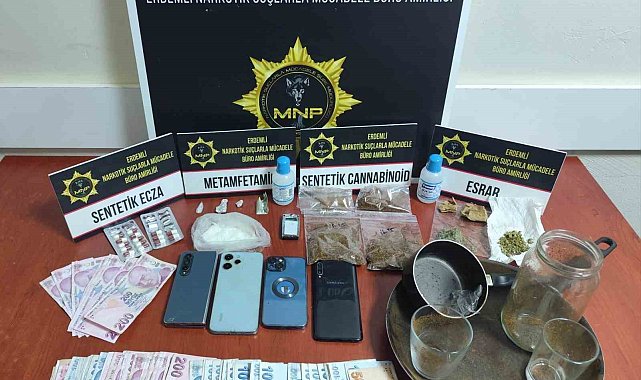 Mersin polisinin yaptığı çalışmada Erdemli ilçesinde uyuşturucu madde ticareti yapan 3 şüpheli yakalanıp tutuklandı.Alınan bilgiye göre, İl Emniyet Müdürlüğü Erdemli Narkotik Büro Amirliği ekipleri, uyuşturucu ile mücadele çerçevesinde çalışma gerçekleştirdi. Ekiplerin çalışmasında, 3 şüpheli belirlenerek Erdemli Cumhuriyet Başsavcılığının koordinesinde operasyon yapıldı. Operasyonda şüpheliler yakalanarak gözaltına alınırken adreslerinde yapılan aramada çeşitli miktarlarda metamfetamin, esrar, sentetik uyuşturucu maddeler ile suçtan elde edilen bir miktar para ele geçirildi.Emniyette ifadesi alınıp adliyeye sevk edilen 3 şüpheli çıkarıldıkları mahkemece tutuklandı.