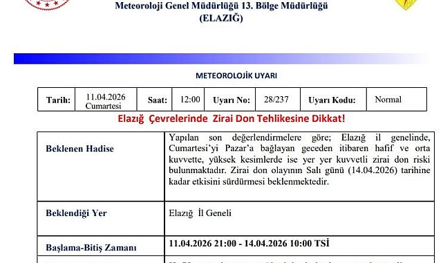 Meteoroloji 13. Bölge Müdürlüğü, Elazığ için zirai don uyarısında bulundu.Meteoroloji 13. Bölge Müdürlüğü'nden yapılan açıklamada, "Yapılan son değerlendirmelere göre; Elazığ il genelinde, cumartesiyi pazara bağlayan geceden itibaren hafif ve orta kuvvette, yüksek kesimlerde ise yer yer kuvvetli zirai don riski bulunmaktadır. Zirai don olayının Salı günü (14.04.2026) tarihine kadar etkisini sürdürmesi beklenmektedir" denildi.