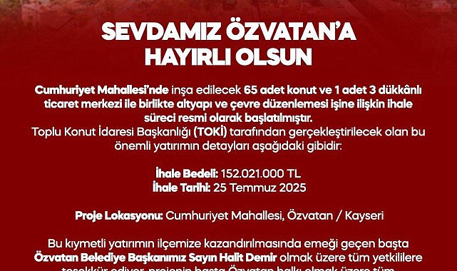 Milliyetçi Hareket Partisi (MHP) Kayseri Milletvekili baki Ersoy, sosyal medya hesabından yaptığı paylaşımla Özvatan ilçesinde konut ve ticaret merkezi ihalesi yapılacağını duyurdu.Ersoy, paylaşımında şu ifadelere yer verdi:"Hayırlı Olsun Özvatan. Özvatan İlçemiz, Cumhuriyet Mahallesi'nde inşa edilecek 65 adet konut ve 1 adet 3 dükkânlı ticaret merkezi ile birlikte altyapı ve çevre düzenlemesi işine ilişkin ihale süreci resmi olarak başlatılmıştır. Toplu Konut İdaresi Başkanlığı (TOKİ) tarafından gerçekleştirilecek olan bu önemli yatırımın detayları aşağıdaki gibidir:İhale Tarihi: 25 Temmuz 2025. Proje Lokasyonu: Cumhuriyet Mahallesi, Özvatan / Kayseri. Bu kıymetli yatırımın ilçemize kazandırılmasında emeği geçen başta Özvatan Belediye Başkanımız Sayın Halit Demir olmak üzere tüm yetkililere teşekkür ediyor, projenin başta Özvatan halkı olmak üzere tüm hemşehrilerimize hayırlı olmasını temenni ediyoruz."