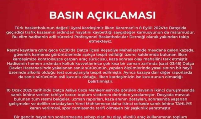 Muğla'nın Datça ilçesinde 8 Eylül 2024 tarihinde gece saatlerinde eski milli basketbolcu İlkan Karaman'a çarparak ölümüne neden olan sürücünün Datça Asliye Ceza Mahkemesinde görülen ikinci duruşmasında cezaevinde kaldığı süre göz önüne alınarak tahliye edilmesine Muğla Cumhuriyet Başsavcılığı itiraz etti.