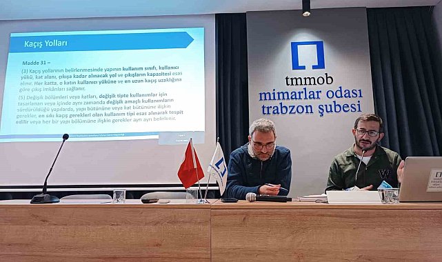 Trabzon Büyükşehir Belediyesi İtfaiye Dairesi Başkanlığı uzmanları, Mimarlar Odası Trabzon Şubesi üyelerine, binalarda yangın güvenliği önlemlerine dair eğitim verdi.