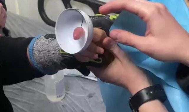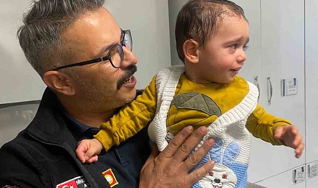 Karabük'ün Safranbolu ilçesinde ailesiyle gittiği otelde minik Emir'in parmağına sıkışan resepsiyon zilini itfaiye ekipleri çıkarttı.
