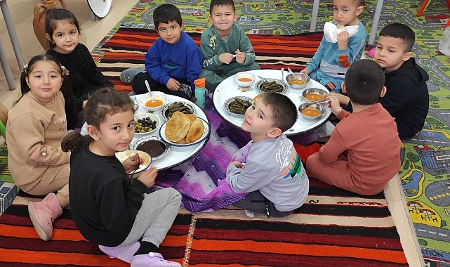 Manisa'nın Sarıgöl ilçesi Bağlıca Halil Duran Anasınıfı öğretmen, öğrenci ve velileri, 'Dilimizin zenginlikleri' projesi kapsamında Türk Kültürünü yaşatmak amacıyla velilerin hazırladıkları yiyeceklerle yer sofrasında kahvaltı yaptı.