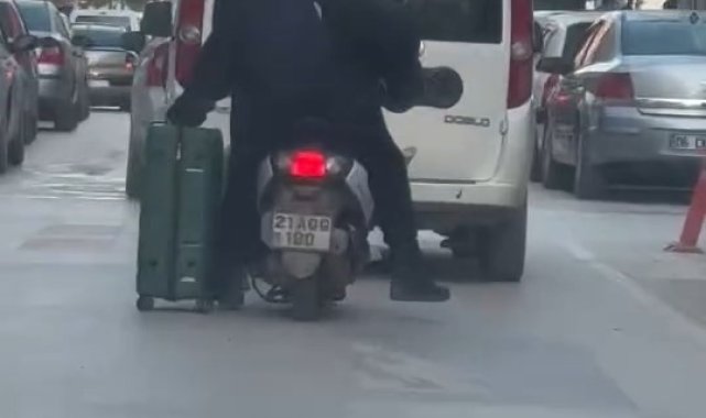Elazığ'da motosiklet ile valiz taşıyan 2 kişi adeta kazaya davetiye çıkartırken o anlar görenleri şaşırttı.Elazığ'da 2 kişi valizi taşımak için ilginç bir yöntem seçti. Biri motosikleti kullanırken diğer ise arkada oturarak valizi tekerlekleri üzerinde gitmesini sağladı. Vali Fahri Bey Caddesi'nde ki o anlar adeta kazaya davetiye çıkartırken, görenleri ise şaşırttı. 2 gencin valiz taşıma yöntemi başka bir sürücü tarafından cep telefonu kamerası ile kaydedildi.