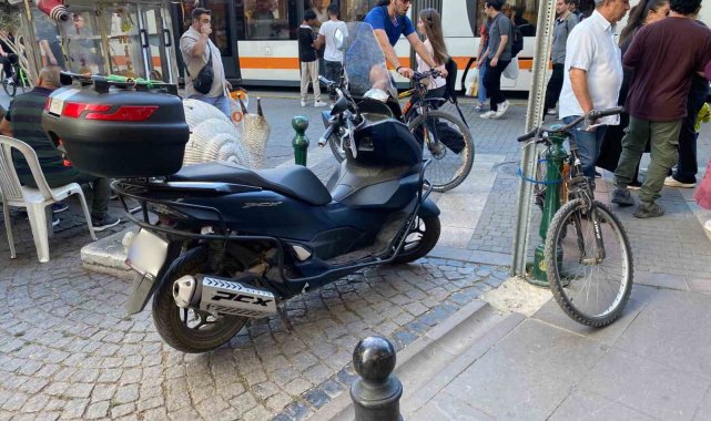 Eskişehir'de 'motosiklet ve bisiklet giremez' levhalarının tam altına park edilen motosiklet ile direğe bağlanan bisiklet, trajikomik bir kare oluşturdu.