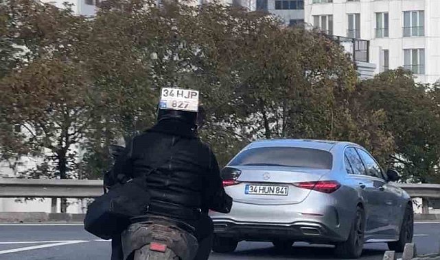 Motosikletin plakasını kaskına taktı, o şekilde trafiğe çıktı