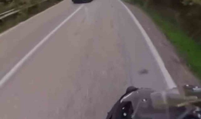 Bursa Gemlik yolu üzerinde seyir halinde olan bir motosikletli, kontrolden çıkarak karşı şeride geçen otomobile çarpmaktan son anda kurtuldu. O anlar motosikletlinin kask kamerasına saniye saniye yansıdı.