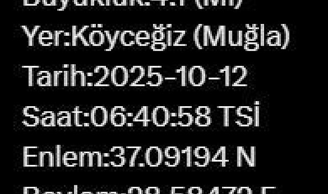 Afet ve Acil Durum Yönetimi Başkanlığı (AFAD), Muğla'da 4.1 büyüklüğünde deprem meydana geldiğini açıkladı.AFAD'ın paylaştığı bilgilere göre, Muğla'nın Köyceğiz ilçesinde saat 02.54'te 4.1 büyüklüğünde deprem meydana geldi. Merkezi Köyceğiz ilçesi olan depremin derinliği 12.01 kilometre olarak ölçüldü.
