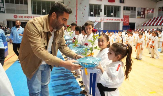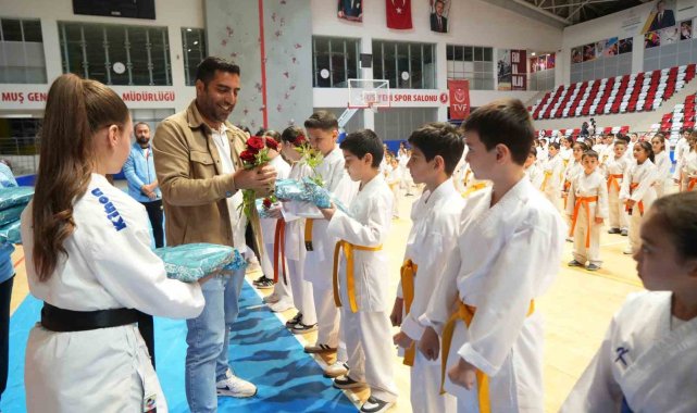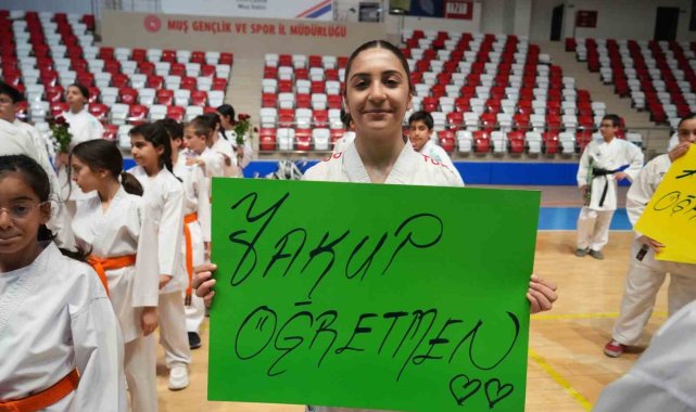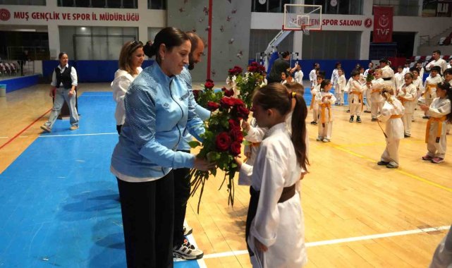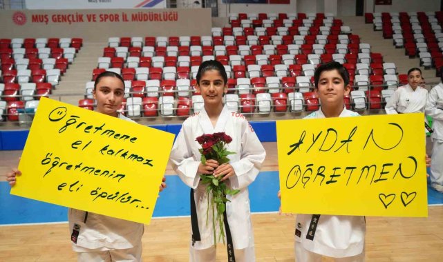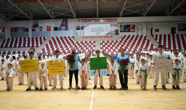 Kahramanmaraş ve Şanlıurfa'da yaşanan olayların ardından Muş'ta karate eğitimi alan 300 öğrenci, kuşak töreninde öğretmenlerine pankart ve güllerle anlamlı bir sürpriz yaptı.