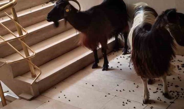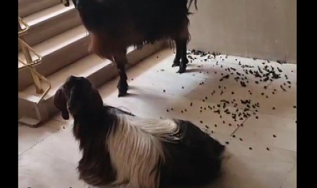 Muş'ta sıcaktan kaçan iki keçi apartmana girdi. Aşağı inmekte inat eden iki keçi asansörle aşağı indirildi. Ortaya renkli görüntüler çıktı.