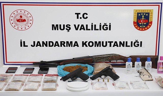 Muş'ta jandarma ekiplerince uyuşturucu madde imal ve ticareti yapan şüphelilere yönelik düzenlenen operasyonda 2 şüpheli tutuklandı.Muş İl Jandarma Komutanlığınca uyuşturucu madde imal ve ticareti yapan kişilere yönelik yürütülen çalışmalar kapsamında Muş merkezde belirlenen adreslere operasyon düzenlendi. Uyuşturucu ticareti yaptığı tespit edilen 6 şüphelinin ikametlerine eş zamanlı operasyon gerçekleştiren ekipler, 5 şüpheliyi yakalayarak gözaltına aldı. Adreslerde yapılan aramalarda 860 gram sentetik kannabinoid (bonzai), 9 parça satışa hazır bonzai, 3 adet ecstasy hap, 10 gram sentetik kannabinoid ham maddesi, 1 gram kokain, 1 hassas terazi, 2 ruhsatsız tabanca, 2 tabanca şarjörü ve 1 ruhsatsız av tüfeği ele geçirildi. Jandarmadaki işlemlerinin ardından adliyeye sevk edilen şüphelilerden 2'si tutuklanırken, 3 kişi adli kontrol şartıyla serbest bırakıldı. Jandarma ekiplerin uyuşturucuyla mücadelesini kararlılıkla sürdürüyor.