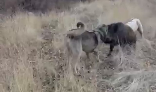 Muş'un Korkut ilçesine bağlı Karakale köyünde tarlaya inen yaban domuzu, çoban köpeklerinin saldırısına uğradı. O anlar cep telefonu kamerasıyla kaydedildi.