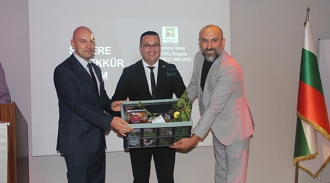 Konuşma bitiminde Bulgaristan Konsolosluğu Ticari Ataşesi Lübomir Lübomirov'a Mustafakemalpaşa'da yetişen, hazırlanan ürünlerden oluşan bir hediye paketi sunuldu.