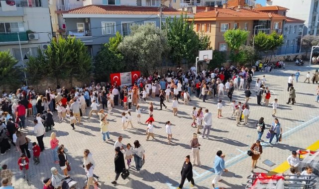 Çeşme Namık Kemal İlkokulu Okul Aile Birliği'nin öncülüğünde düzenlenen "Gazze için seferber" temalı etkinlikte, öğrenciler, veliler ve öğretmenler el ele vererek örnek davranış sergiledi.