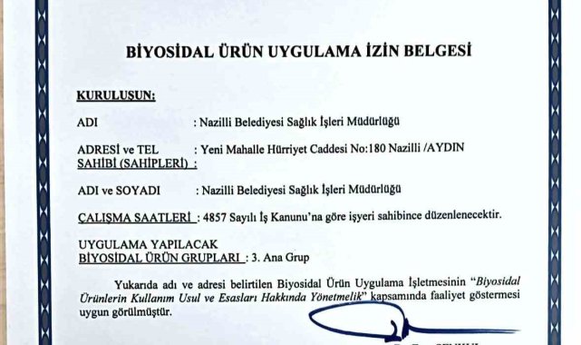 Kurum standartlarını artırmak için çalışmalarına devam eden Nazilli Belediyesi, Sağlık İşleri Müdürlüğü bünyesinde ev ve işyerlerini ilaçlamak ve firmalara belge verebilmek için Aydın İl Sağlık Müdürlüğü'nden gerekli izinleri aldı.