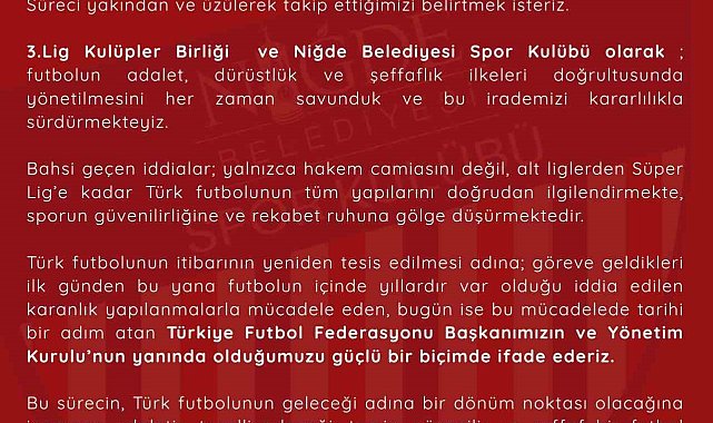 Niğde Belediyespor'dan yapılan açıklamada, sürecin yakından ve üzüntüyle takip edildiği belirtilerek futbolun adalet, dürüstlük ve şeffaflık ilkeleri doğrultusunda yönetilmesi gerektiği vurgulanarak, şu ifadelere yer verildi:
