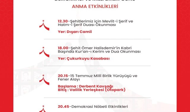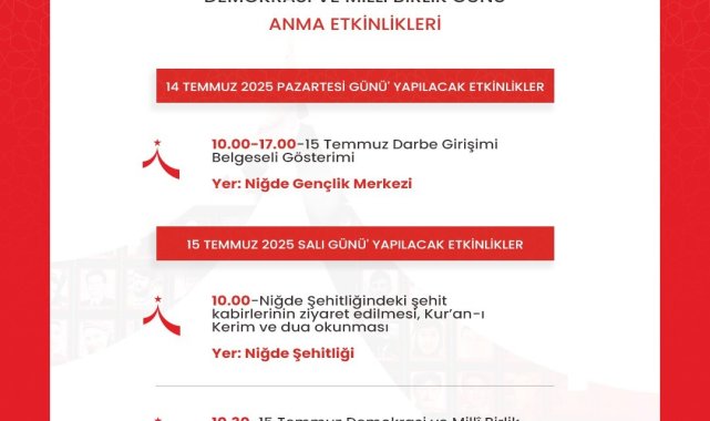 15 Temmuz Demokrasi ve Milli Birlik Günü dolayısıyla Niğde'de bir dizi anma etkinliği düzenlenecek.Niğde Valiliği tarafından hazırlanan programa göre, etkinlikler 14 Temmuz Pazartesi günü saat 10.00'da Niğde Gençlik Merkezi'nde başlayacak. 15 Temmuz Darbe Girişimi Belgeseli gösterimi ile katılımcılara o gece yaşananların detaylı bir şekilde aktarılacak.15 Temmuz Salı günü sabah saatlerinde şehitlik ziyaretiyle başlayacak olan program, saat 10.00'da Niğde Şehitliği'nde düzenlenecek Kur'an-ı Kerim tilaveti ve dua ile devam edecek. Ardından saat 10.30'da Şadırvan Parkı'nda 15 Temmuz temalı fotoğraf sergisi açılışı gerçekleştirilecek.Aynı gün öğle saatlerinde Dışarı Camii'nde şehitler için Mevlid-i Şerif okutulacak. 18.00'de ise Çukurkuyu Kasabası'nda, 15 Temmuz'un simge ismi, Niğdeli kahraman Astsubay Ömer Halisdemir'in kabri başında Kur'an-ı Kerim ve dua programı düzenlenecek.Akşam saatlerinde ise yüzlerce vatandaşın katılması beklenen "Milli Birlik Yürüyüşü" Derbent Kavşağı'ndan başlayacak ve valilik yerleşkesi otoparkında sona erecek. Yürüyüşün ardından saat 20.45'te başlayacak Demokrasi Nöbeti programında, Kur'an-ı Kerim tilaveti yapılacak, 15 Temmuz'u anlatan belgesel gösterimi sunulacak, protokol konuşmalarının ardından ise mehter takımı gösterisi ve konser ile gece sona erecek.Niğde Valiliği tarafından yapılan açıklamada, tüm vatandaşlar düzenlenecek programlara davet edildi.Açıklamada, "15 Temmuz, milletimizin vatanına, bayrağına ve demokrasisine sahip çıktığı şanlı bir direniştir. Aziz şehitlerimizi rahmet ve minnetle anarken, bu anlamlı günü hep birlikte yaşayacağız" ifadelerine yer verildi.