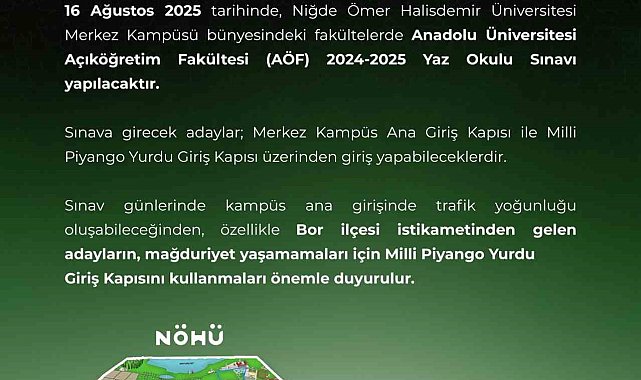 16 Ağustos 2025 tarihinde Niğde Ömer Halisdemir Üniversitesi Merkez Kampüsü'nde, Anadolu Üniversitesi Açıköğretim Fakültesi (AÖF) 2024-2025 Yaz Okulu Sınavı gerçekleştirilecek.Sınava katılacak adaylar, Merkez Kampüs Ana Giriş Kapısı ile Milli Piyango Yurdu Giriş Kapısı üzerinden kampüse giriş yapabilecek.Kampüs ana girişinde oluşabilecek trafik yoğunluğu nedeniyle özellikle Bor ilçesi yönünden gelen adayların mağduriyet yaşamamaları için Milli Piyango Yurdu Giriş Kapısı'nı kullanmaları duyuruldu.Niğde Valiliği tarafından yapılan açıklamada, sınav günlerinde adayların güvenli ve düzenli bir şekilde kampüse ulaşabilmeleri için bu yönlendirmeye uyulması istendi.