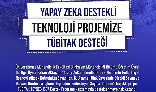 Niğde Ömer Halisdemir Üniversitesi Mühendislik Fakültesi Bilgisayar Mühendisliği Bölümü Öğretim Üyesi Dr. Öğr. Üyesi Hakan Aktaş'ın yürütücüsü olduğu 'Yapay Zeka Teknolojileri ile Her Türlü Endüstriyel Nesneyi Yüksek Doğrulukta Sayabilen, İki Aşamalı Oluk Sayesinde Sürekli Sayım ve Hassas Durdurma İşlemi Yapabilen Endüstriyel Sayma Sistemi' isimli projesi; TÜBİTAK TEYDEB 1507 destek programı kapsamında desteklenmeye hak kazandı.
