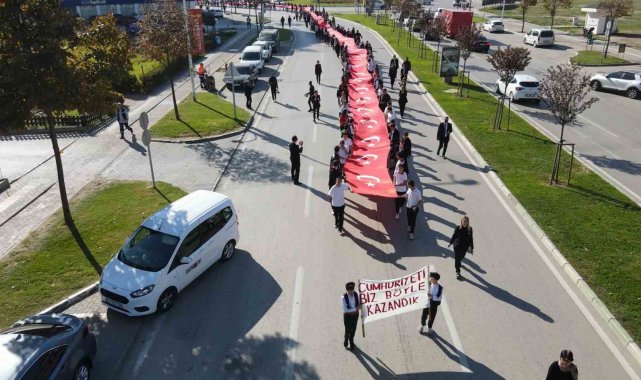 Bursa'da yüzlerce öğrenci 500 metrelik dev bayraklı kortej yapıp teröre lanet, yaşasın Cumhuriyet yürüyüşü gerçekleştirdi. Cumhuriyet Bayramı öncesi TUSAŞ'a yapılan hain saldırıyı da kınayan öğrenciler ellerinde bayraklarda okullarından çıkıp Ahmet Taner Kışlalı ve Özlüce Bulvarında yürüyüş gerçekleştirdi.Cumhuriyetin 101. yılını karşılamaya sayılı günler kala, Altınşehir Okulları öğrencileri 500 metrelik Türk Bayrağı ile gerçekleştirdikleri bayrak yürüyüşü ile teröre lanet okuyup tüm yurda birlik beraberlik mesajı verdi.Her yıl Cumhuriyet Bayramı kutlamaları kapsamında gelenek haline gelen bayrak yürüyüşünde bu yıl teröre tepki dikkat çekti. TUSAŞ'a yapılan hain saldırıyı kınayan yüzlerce öğrencinin 500 metrelik dev Türk bayrağı ile düzenlediği yürüyüş vatandaşlar tarafından da büyük ilgi topladı. İlkokul, ortaokul ve lise öğrencilerinin katılımıyla gerçekleştirilen etkinlikte, öğrenciler coşkulu bir kortej oluşturarak Türk Bayrağı'nı gururla taşıdı. Öğretmenler, gaziler ve velilerin de destek verdiği yürüyüş, renkli ve anlamlı anlara sahne oldu.Altınşehir Okulları'nın kurucusu Umut Gökçe; öğrencilerin bu anlamlı yürüyüşle Cumhuriyet değerlerine sahip çıktığını ve gösterdikleri birliktelik ile gurur kaynağı olduklarını dile getirdi. TUSAŞ'a yapılan hain terör saldırısını da okul olarak kınadıklarını dile getiren Gökçe, "500 metrelik Türk Bayrağı'mızla birlikte hem terörü lanetlemek hem de Cumhuriyetimizin yaklaşan 101'inci yaşını kutlamak için 900 öğrencimizle birlikte Özlüce Bulvarı'nda yürüyüş gerçekleştirdik. Öğrencilerimizle birlikte duyarlılığımızı gösterip memleketimize, ülkemize sahip çıktığımızı bir kere daha haykırıyoruz. Buradaki temel amacımız öğrencilerin memleketine, milletine bağlı ve üretimle, fikirle ülkesine katkı sağlayacak çocuklar olmasını sağlamak. Ülkesini seven ülkesine bağlı kocaman bir aileyiz biz" diye konuştu.Velilerin yoğun katılımıyla daha da anlam kazanan etkinlikte, katılımcılar Cumhuriyet'in 101. yılını coşkuyla kutladı. Öğrenciler, 500 metrelik Türk bayrağını taşımanın heyecanını yaşarken, izleyiciler tarafından büyük beğeni topladılar. Etkinlik, Cumhuriyet Bayramı ruhunu yansıtan bu anlamlı yürüyüş ile hafızalarda iz bıraktı.