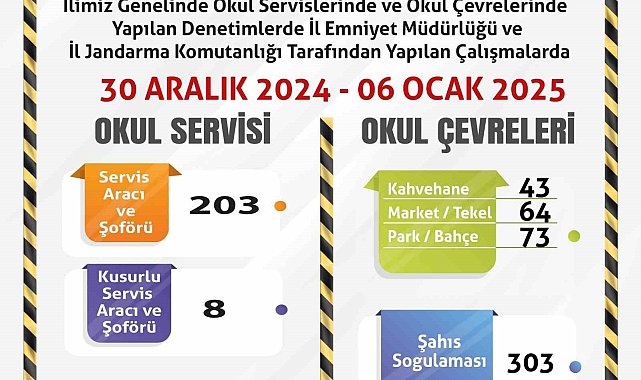 Eskişehir'de polis ve jandarma ekiplerince okulların çevresinde bulunan çok sayıda işletme denetlenirken, 203 servis aracı ve 303 vatandaş kontrol edildi.Edinilen bilgilere göre, İl Emniyet Müdürlüğü'ne ve İl Jandarma Komutanlığı'na bağlı ekipler tarafından okul çevrelerinde denetim gerçekleştirildi. Denetimlerde, 203 okul servis aracı ve sürücüsü kontrol edilirken, kusurlu bulunan 8 sürücüye işlem gerçekleştirildi. Ayrıca ekipler tarafından okul çevrelerinde bulunan 43 kahvehane, 64 market ve 73 parkta denetim gerçekleştirildi. Denetimlerde, 303 şahsa kimlik sorgulaması yapıldı.