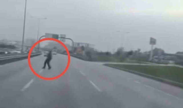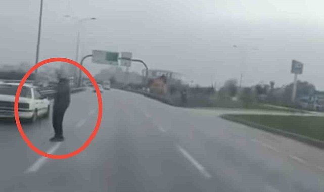 Bursa Yakın Çevre Yolu üzerinde araçların arasından yolun karşısına geçmeye çalışan kişi ölüme davetiye çıkarırken, o anlar cep telefon kamerasına yansıdı.