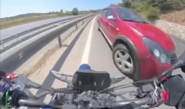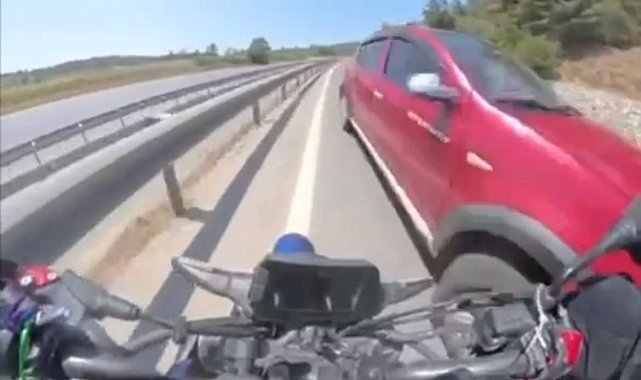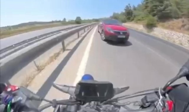 Bursa İstanbul karayolunda sol şeritte hızla ilerleyen motosikletli, ters yönden gelen otomobili son anda fark etti. Facianın teğet geçtiği o anlar kask kamerasına anbean yansıdı.