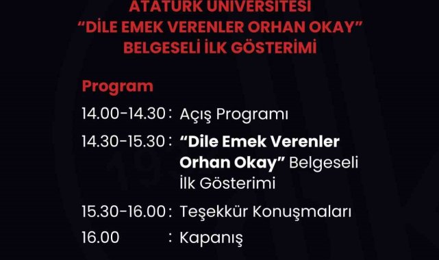 Türk Dil Kurumu tarafından Dile Emek Verenler belgesel serisinin 3. Bölümü uzun yıllar Atatürk Üniversitesinde görev yapmış Prof. Dr. Orhan Okay hakkında çekildi.Dile Emek Verenler Orhan Okay belgeselinin ilk gösterimi daha önce Dile Emek Verenler Efrasiyap Gemalmaz belgeselinde olduğu gibi yıllarca hizmet ettiği Erzurum'da, Erzurum Atatürk Üniversitesinde bir vefa örneği olarak gerçekleştirilecek.Gösterim 31 Ekim 2025 Cuma günü saat 14.00'te Atatürk Üniversitesi Kültür Merkezi Prof.Dr. Kemal Bıyıkoğlu Konferans Salonunda gerçekleşecek. Belgesel gösterimi halka açık olacak. Programda açış konuşmalarının ardından, belgesel gösterimi yapılacak.Program sonunda teşekkür konuşmaları olacak.