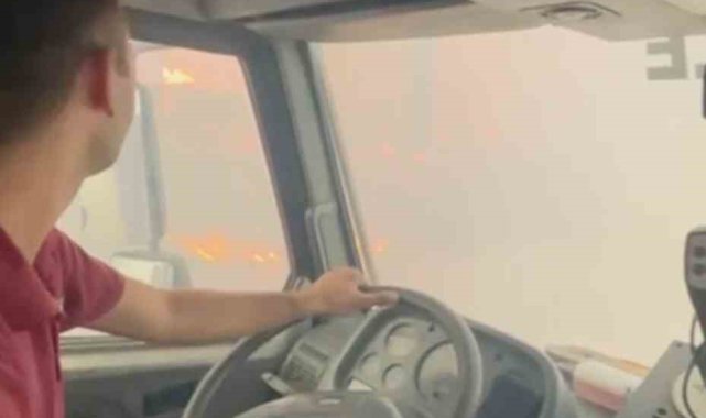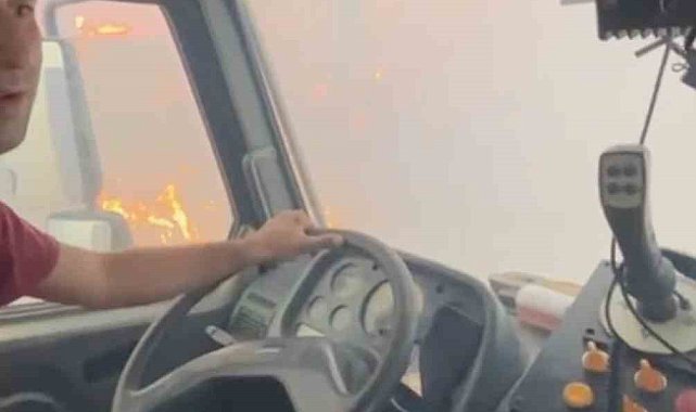 Çanakkale'nin Ezine ilçesinde çıkan orman yangınına Orman Bölge Müdürlüğü ekipleri havadan ve karadan müdahale ediyor. Bu sırada alevlerin arasında kalan bir arazözdeki orman işçileri, o zor anları cep telefonu kameralarıyla kaydetti.
