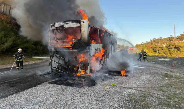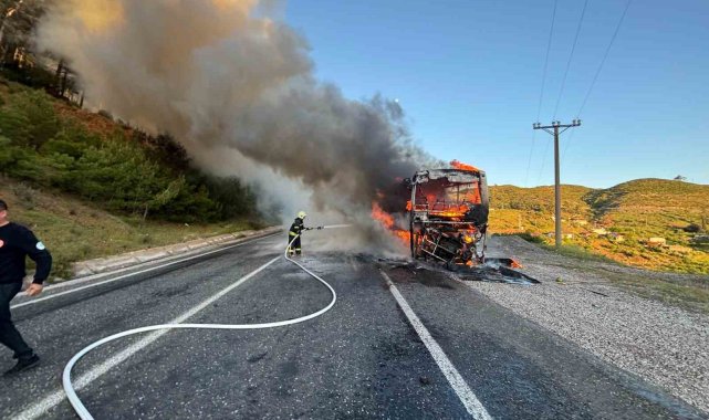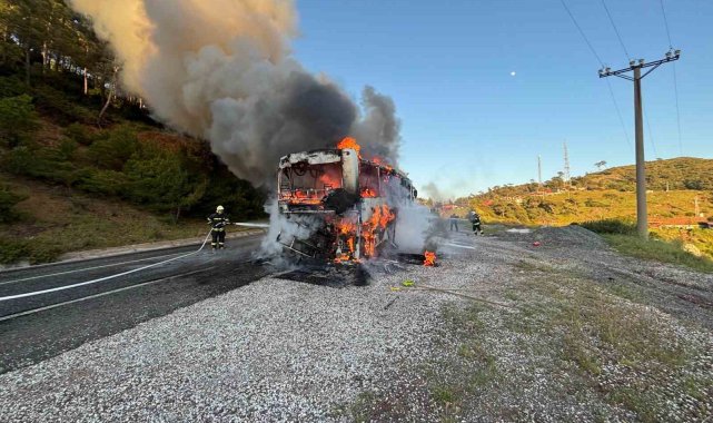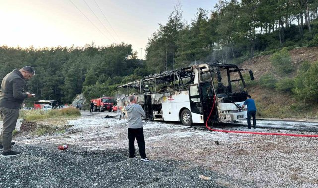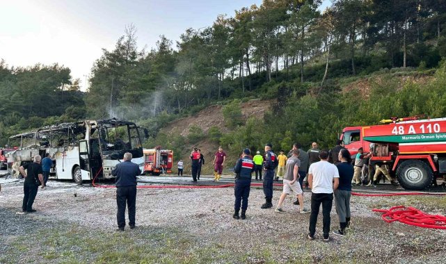 Marmaris Datça Karayolu'na seyir halindeyken yanmaya başlayan tur otobüsü kısa sürede alev topuna dönerken, yolcuların tahliye edilmesiyle facia önlendi, yangın ekiplerin hızlı müdahalesiyle ormana sıçramadan söndürüldü.