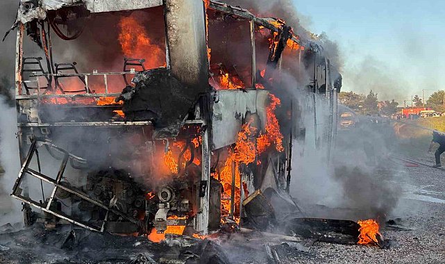 Marmaris Datça Karayolu'na seyir halindeyken yanmaya başlayan tur otobüsü kısa sürede alev topuna dönerken, yolcuların tahliye edilmesiyle facia önlendi, yangın ekiplerin hızlı müdahalesiyle ormana sıçramadan söndürüldü.Olay, Muğla'nın Marmaris-Datça Karayolu Mezargediği mevkiinde saat 19.00 sıralarında meydana geldi. Edinilen bilgiye göre, seyir halindeki bir tur otobüsü, henüz bilinmeyen bir nedenle yanmaya başladı. Dumanları fark eden şoför aracı durdururken, yolcular ve sürücü hızla otobüsten indi. Kısa sürede alev topuna dönen otobüs çevrede kısa süreli paniğe neden oldu. İhbar üzerine bölgeye sevk edilen itfaiye ve orman ekipleri yangına müdahale etti. Ekiplerin hızlı müdahalesi sayesinde alevler çevredeki ormanlık alana sıçramadan kontrol altına alınarak söndürüldü. Yangında can kaybı ve yaralanma yaşanmazken, otobüs kullanılamaz hale geldi. Olayla ilgili inceleme başlatıldı.