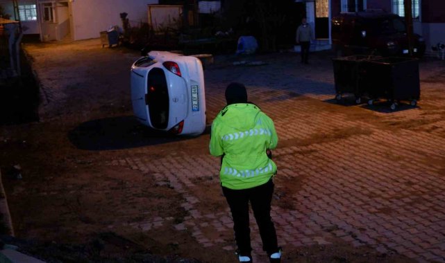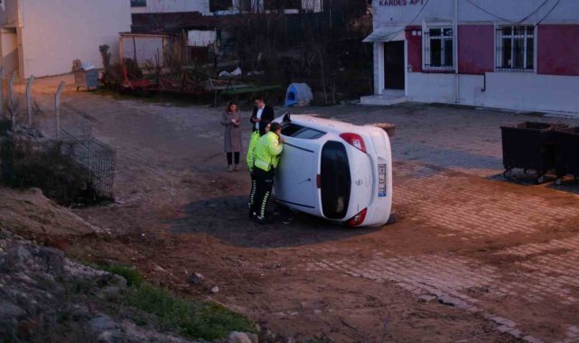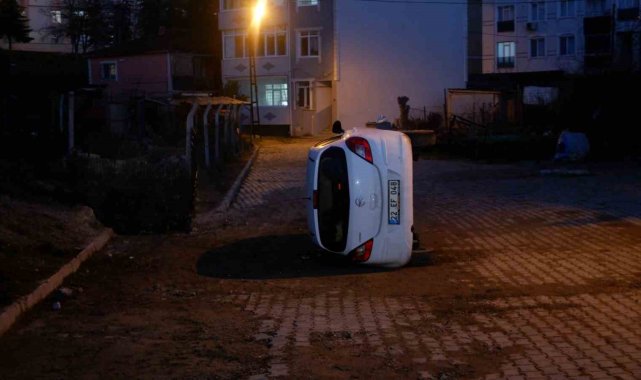 Edirne'de 5 metre yükseklikten yolun kenarına uçarak yan devrilen otomobilin sürücüsü, emniyet kemeri sayesinde kazadan yara almadan kurtuldu.