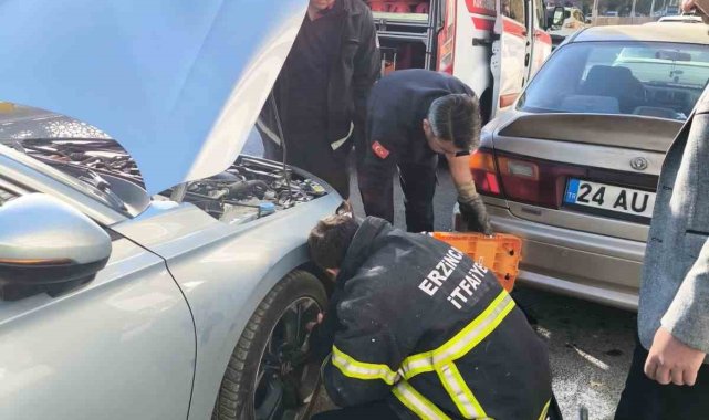 Erzincan'da aracın motor kısmına sıkışan yavru kedi, itfaiye ekiplerinin müdahalesiyle kurtarıldı.