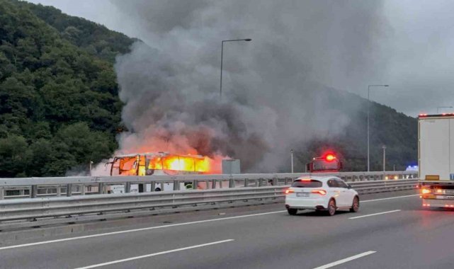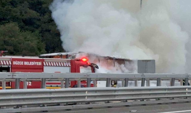 Anadolu Otoyolu Düzce mevkinde şehirlerarası yolcu otobüsü alev alev yandı, İstanbul istikameti trafiğe kapandı.