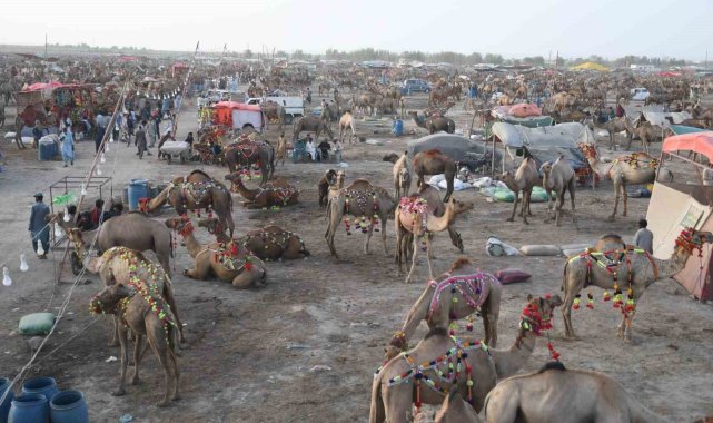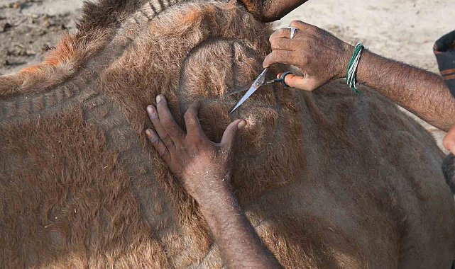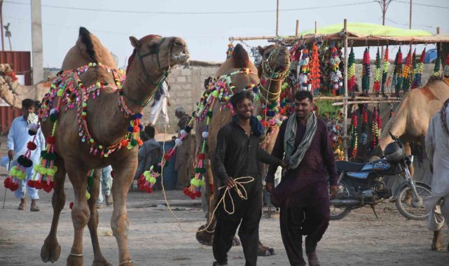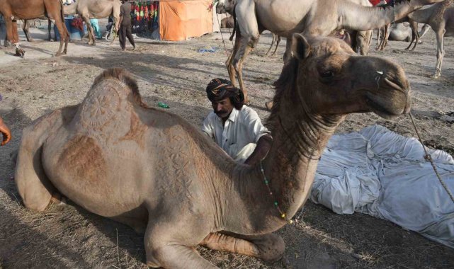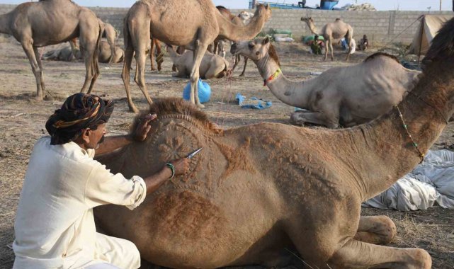 Pakistan'ın Karaçi şehrinde Kurban Bayramı öncesi tüyleri kesilen develer, geleneksel motiflerle süslenerek görücüye çıktı.Pakistan'ın Sindh eyaletinde bulunan Karaçi şehrinde Asya'nın en büyük kurban pazarı kuruldu. Pazarda kurbanlık hayvan satışları devam ederken her yıl olduğu gibi bu yıl da pazar yerindeki develer tüyleri kesilerek süslendi. Develeri süsleyen Hashim Mallah, hayvanların tüylerini makas ile keserek farklı geleneksel motiflerle develeri bayrama hazırladı. Deve berberliğini aile büyüklerinden öğrendiğini söyleyen Mallah, bu işin kendisi için bir gelir kaynağı olmasının yanı sıra bir tutku olduğunu belirtti. Mallah, "Bu mesleği babamdan öğrendim. Kendisi de kurbanlık hayvanları süslerdi. Şimdi onun işini ben yapıyorum, daha önce ne yaptıysa aynısını yapıyorum. Benim tek amacım hayvanların güzel gözükmesini sağlayıp müşterilerin ilgisini çekmek" dedi.Mallah, meslekten kazancı sorulduğunda ise "Bir günde 30 ile 40 arasında hayvan süslemekten günde 15 bin ile 20 bin rupi arasında para kazanıyorum" ifadelerini kullandı.