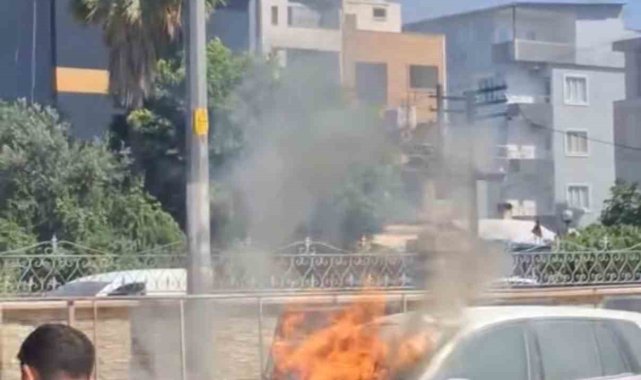 Hatay'ın İskenderun ilçesinde park halindeyken alev alev yanan otomobil paniğe neden olurken o anlar anbean cep telefonu kamerasına yansıdı.