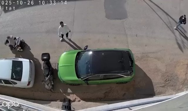 Bursa'da park halindeki bir otomobile çarpan elektrikli bisiklet, hiçbir şey olmamış gibi kaçtı. O anlar güvenlik kamerasına saniye saniye yansıdı.
