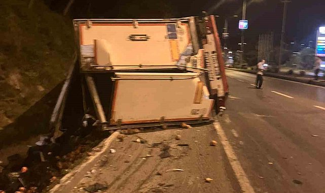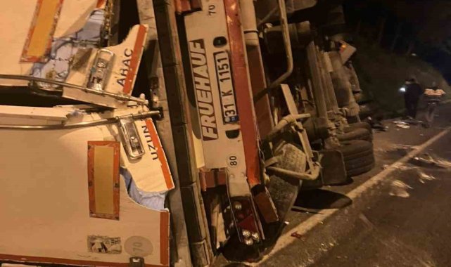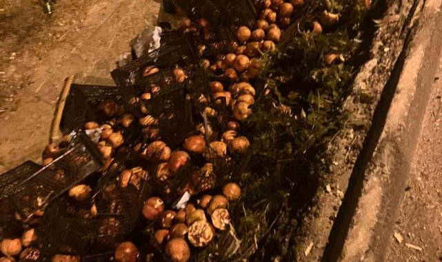 Hatay'da park halindeyken freni boşalan tır şarampole devrildi. Kazada tırdan yola nar döküldü.