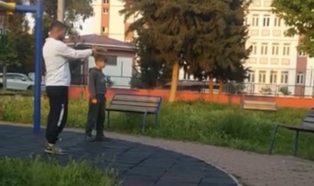 Parkta çocuğa oyuncak silahla atış talimi yaptırdı