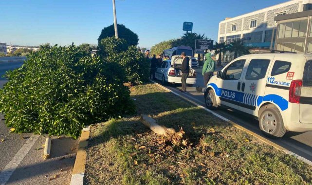 Antalya'nın Serik ilçesinde otomobil sürücüsü, yoldan refüje çıktığı sırada ağaçları devirdi, aydınlatma direğine çarparak durabildi. Kazada 1 kişi yaralandı.