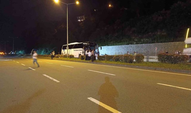 Rize'de kontrolünü kaybederek refüje çıkan şehirlerarası yolcu otobüsü, bariyerleri altına aldıktan sonra aydınlatma direğine çarparak durabildi.