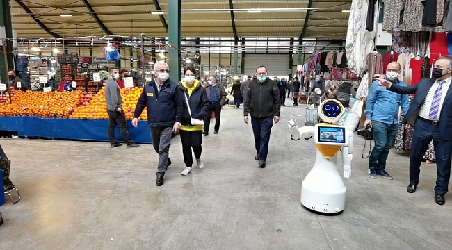 Sosyal mesafe konusunda da uyarılarda bulunan robot, bir pazarcıdan kurşunlu çileği aldı.