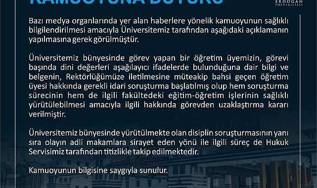 RTEÜ tarafından yapılan açıklamada hakkında 'Dini değerleri aşağılayıcı ifadeler kullandığı iddia edilen' Eğitim Fakültesinde görevli akademisyenin görevden uzaklaştırılarak hakkında işlem başlatıldığı duyuruldu.