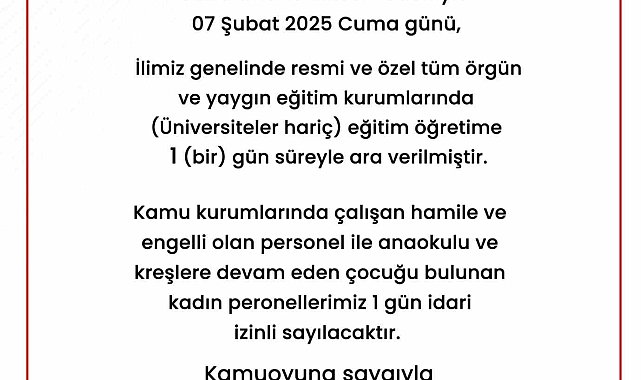 Sakarya'da etkisini artırarak sürdürmesi beklenen kar yağışı sebebi ile okullar 1 gün daha tatil edildi.Sakarya'da sabah saatlerinde başlayan ve etkisini artırarak sürdürmesi beklenen kar yağışı sebebi ile okullar 1 gün daha tatil edildi. Konuya ilişkin Sakarya Valiliği'nden yapılan yazılı açıklamada, "Son meteorolojik değerlendirmelere göre; kar yağışının etkisini artırarak sürdürecek olması ve buzlanma tehlikesi nedeniyle 7 Şubat 2025 Cuma günü, ilimiz genelinde resmi ve özel tüm örgün ve yaygın eğitim kurumlarında (üniversiteler hariç) eğitim öğretime 1 (bir) gün süreyle ara verilmiştir. Kamu kurumlarında çalışan hamile, engelli ve kronik hastalığı olan personel ile anaokulu ve kreşlere devam eden çocuğu bulunan kadın personellerimiz 1 gün idari izinli sayılacaktır" denildi.