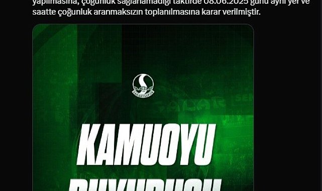 Sakaryaspor Kulübü Derneği Yönetim Kurulu, gerçekleştirdikleri toplantıda Olağanüstü Genel Kurul kararı aldı.Konuya ilişkin Sakaryaspor'un sosyal medya hesabından yapılan yazılı açıklamada, "Sakaryaspor Kulübü Derneği Yönetim Kurulu 17.05.2025 tarihinde saat 14.00'de dernek merkezinde gerçekleştirdikleri toplantıda oy çokluğu ile Olağanüstü Genel Kurul kararı almışlardır. Sakaryaspor Kulübü'nün Olağanüstü Genel Kurul Toplantısı 1 Haziran 2025 günü saat 12.00'de Sakarya Atatürk Stadyumu'nda yapılmasına, çoğunluk sağlanamadığı taktirde 8 Haziran 2025 günü aynı yer ve saatte çoğunluk aranmaksızın toplanılmasına karar verilmiştir" denildi.