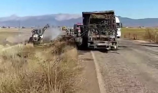 Denizli'de saman yüklü kamyon yangın sonrası kullanılamaz hale geldi.