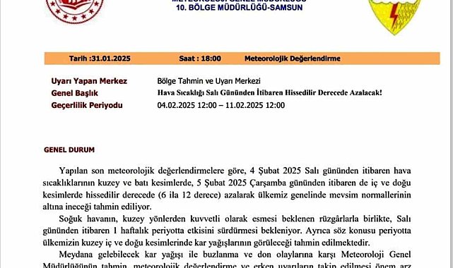 6 dereceye gerilemesi bekleniyor.Samsun'da hava sıcaklığı salı gününden itibaren hissedilir derecede azalacak. Meteoroloji verilerine göre 4 Şubat Salı gününden itibaren hava sıcaklıklarının kuzey ve batı kesimlerde, 5 Şubat Çarşamba gününden itibaren de iç ve doğu kesimlerde hissedilir derecede (6 ile 12 derece) azalarak Türkiye genelinde mevsim normallerinin altına ineceği tahmin ediliyor.Konuyla ilgili yapılan açıklamada, "Samsun'da salı gününden itibaren gerçekleşmesi beklenen günün en yüksek ve en düşük hava sıcaklıklarının 6/5 derece olması bekleniyor. Soğuk havanın kuzey yönlerden kuvvetli olarak esmesi beklenen rüzgârlarla birlikte salı gününden itibaren bir haftalık periyotta etkisini sürdürmesi bekleniyor. Söz konusu periyotta ülkemizin kuzey, iç ve doğu kesimlerinde kar yağışlarının görüleceği tahmin edilmektedir. Meydana gelebilecek kar yağışı ile buzlanma ve don olaylarına karşı Meteoroloji Genel Müdürlüğünün tahmin, meteorolojik değerlendirme ve erken uyarılarının takip edilmesi önem arz etmektedir" ifadelerine yer verildi.