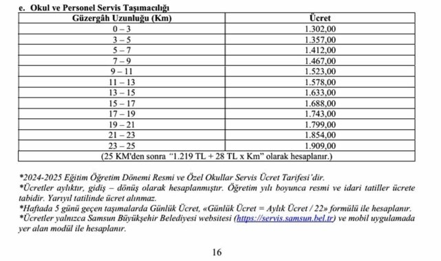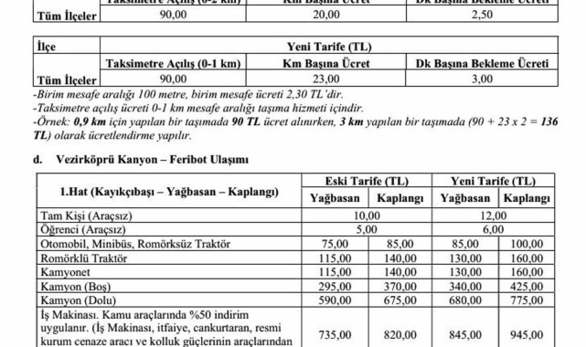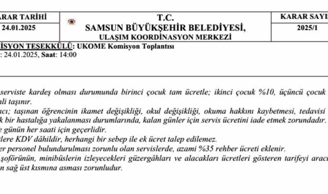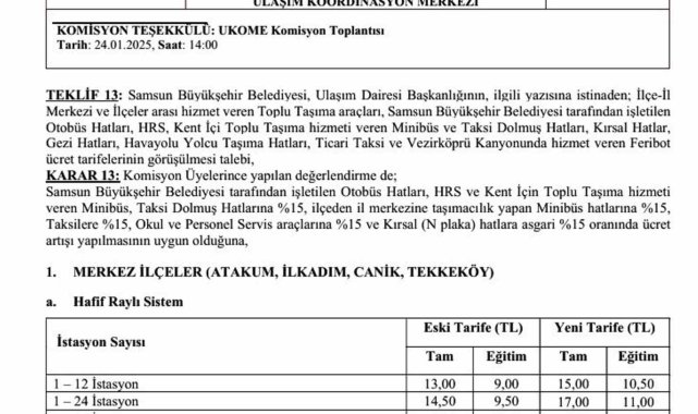 Samsun'da toplu ulaşım hizmeti veren otobüs hatları, hafif raylı sistem (tramvay), minibüs, taksi-dolmuş hatları, ticari taksi, okul-personel servis araçlarına ve kırsal (N plaka) hatlara yüzde 15 oranında zam yapıldı.Samsun Büyükşehir Belediyesi Ulaşım Koordinasyon Merkezi (UKOME) Komisyon Toplantısında il genelinde toplu taşıma hizmeti veren araçların ücret tarifesi görüşüldü. Görüşmeler kapsamında otobüs hatları, raylı sistem, minibüs, taksi-dolmuş hatları, ticari taksi, okul-personel servis araçlarına, kırsal (N plaka) hatlara yüzde 15 oranında zam yapılması karara bağlandı.Tramvay ve otobüs fiyat tarifesiGüncellenen yeni tarife ile birlikte tramvay ücretleri (1-12 istasyon) tam 13 TL'den 15'e, öğrenci 9 TL'den 10,5 TL'ye yükseldi. Şehir içi otobüs hatları tam 17 TL'den 19,5 TL'ye, öğrenci 11 TL'den 12,5 TL'ye çıktı. Tramvay-otobüs aktarma ücretleri ilk aktarma 'ücretsiz', ikinci aktarma ücreti ise 4,5 TL'den 5,20 TL'ye yükseldi. Ayrıca tramvay abonmanlık ücreti tam (50 biniş) 580 TL'den 670 TL'ye, öğrenci de (50 biniş) 290 TL'den 340 TL'ye çıktı.Taksi-dolmuş ve minibüs dolmuş fiyat tarifesiMinibüs-dolmuş hatları fiyat tarifesi güncellemesi kapsamında tam 21 TL'den 24 TL'ye, öğrenci 16 TL'den 18 TL'ye yükseldi. Aynı zamanda 1, 2, 3 ve 4 Nolu Taksi-Dolmuş Hatlarının ücretleri tam 21 TL'den 24 TL'ye, öğrenci 16 TL'den 18 TL'ye çıktı.İlçe minibüs hatları fiyat tarifesiİlçeler ile Samsun merkez arasında yapılan taşımacılık fiyat tarifeleri de yüzde 15 oranında zamlanırken Alaçam-Samsun tam 105 TL, öğrenci 85 TL oldu. Asarcık-Samsun tam 100 TL, öğrenci 80 TL olarak belirlendi. Ayvacık-Samsun tam 85, öğrenci 70 TL olarak güncellendi. Bafra-Samsun tam 70 TL, öğrenci 55 TL. Çarşamba-Samsun tam 60 TL, öğrenci 45 TL. Havza-Samsun tam 115 TL, öğrenci 90 TL. Kavak-Samsun tam 75 TL, öğrenci 60 TL. Ladik-Samsun tam 115 TL, öğrenci 90 TL. 19 Mayıs-Samsun tam 50 TL, öğrenci 40 TL. Salıpazarı-Samsun tam 80 TL, öğrenci 65 TL. Terme-Samsun tam 85 TL, öğrenci 70 TL. Vezirköprü-Samsun tam 150 TL, öğrenci 120 TL. Yakakent-Samsun tam 115 TL, öğrenci ise 90 TL.Ticari taksi fiyat tarifesiMevcut tarifede taksimetre açılışı (0-2 km) 90 TL'den (0-1 km) 90 TL'ye yükseltildi. Ayrıca kilometre başında ücret 20 TL'den 23 TL'ye, dakika başına ücret de 2,5 TL'den 3 TL'ye çıkartıldı.İl idarecilerinin imzası ile birlikte yürürlüğe girecek tarife kapsamında okul ve personel taşımacılığı yapan servis ücretleri en kısa mesafe (0-3 km) bin 302 TL, en uzun mesafe (23-25 km) bin 909 TL oldu.Servis ücretini geri alabileceğiniz durumlarKomisyon tarafından ayrıca şu kararlar alındı:"Aynı serviste kardeş olması durumunda birinci çocuk tam ücretle, ikinci çocuk yüzde 10, üçüncü çocuk yüzde 20 indirimli taşınır. Taşıyıcı; taşınan öğrencinin ikamet değişikliği, okul değişikliği, okuma hakkını kaybetmesi, tedavisi uzun sürecek bir hastalığa yakalanması durumlarında, kalan günler için servis ücretini iade etmek zorundadır. Tarife günün her saati için geçerlidir. Ücretlere KDV dâhildir, herhangi bir sebep ile ek ücret talep edilemez. Rehber personel bulundurulması zorunlu olan servislerde, azami yüzde 35 rehber ücreti eklenir. Araç şoförünün, minibüslerin izleyecekleri güzergâhları ve alacakları ücretleri gösteren tarifeyi aracın ön camının sağ üst kısmına asması zorunludur."