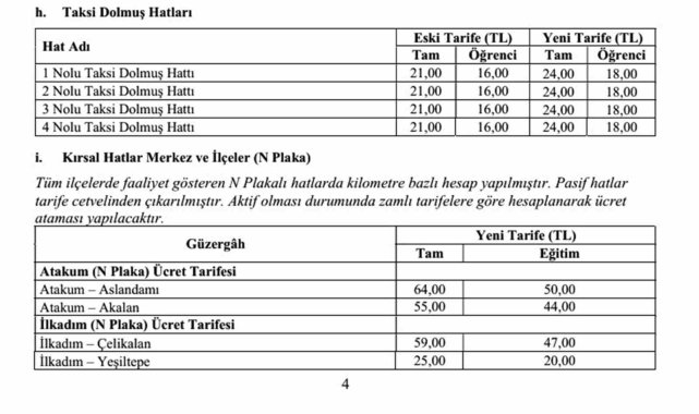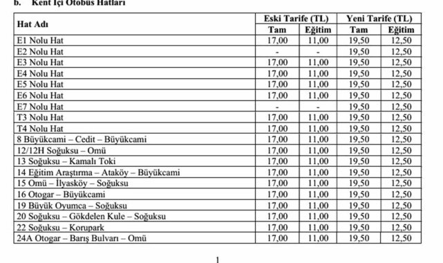 Samsun'da toplu ulaşım hizmeti veren otobüs hatları, hafif raylı sistem (tramvay), minibüs, taksi-dolmuş hatları, ticari taksi, okul-personel servis araçlarına ve kırsal (N plaka) hatlara yüzde 15 oranında zam yapıldı.